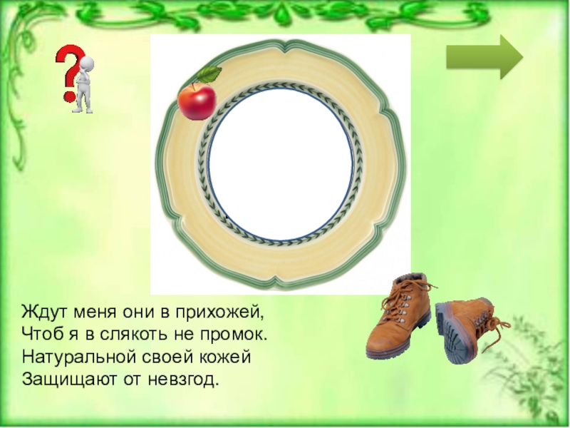 БОТИНКИЖдут меня они в прихожей, Чтоб я в слякоть не промок. Натуральной своей кожей Защищают