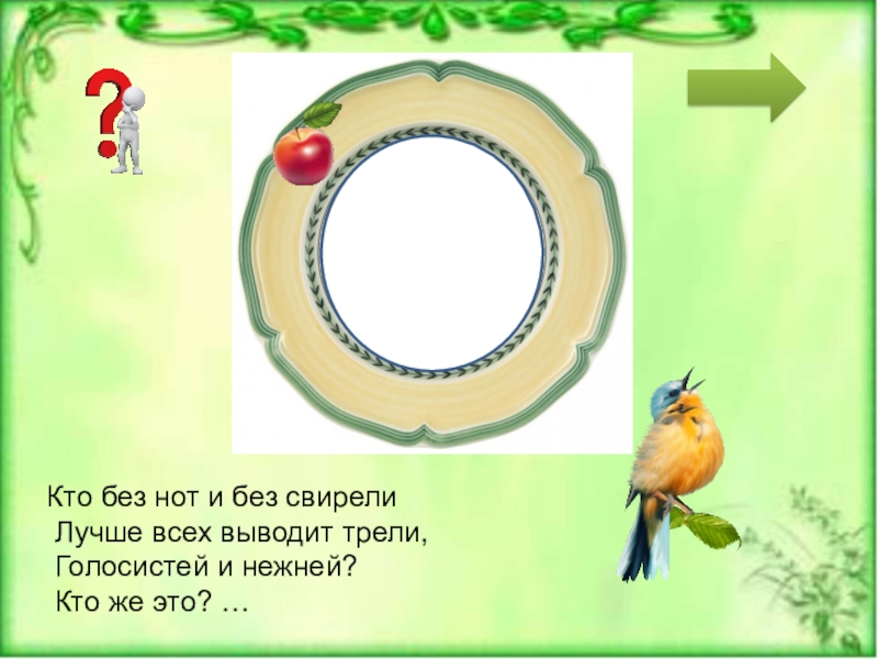 СОЛОВЕЙКто без нот и без свирели Лучше всех выводит трели, Голосистей и нежней? Кто же это? …