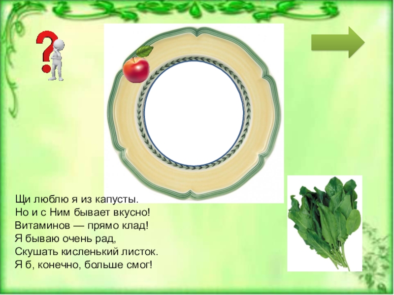 ЩАВЕЛЬЩи люблю я из капусты.  Но и с Ним бывает вкусно! Витаминов — прямо клад! Я бываю очень рад,  Скушать