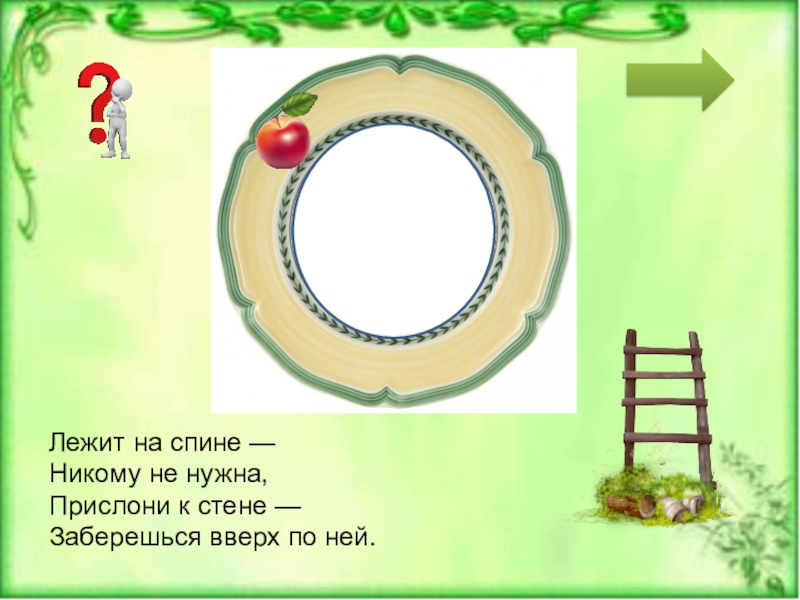 ЛЕСТНИЦАЛежит на спине — Никому не нужна, Прислони к стене — Заберешься вверх по ней.