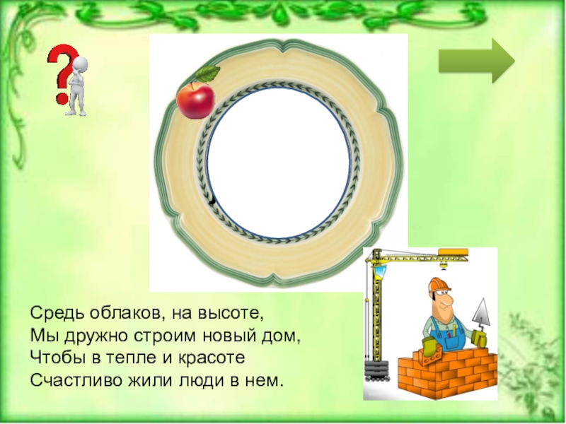 СТРОИТЕЛЬСредь облаков, на высоте,  Мы дружно строим новый дом,  Чтобы в тепле и красоте  Счастливо жили люди