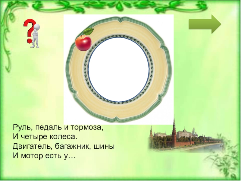 СТОЛИЦАРуль, педаль и тормоза, И четыре колеса. Двигатель, багажник, шины И мотор есть у…