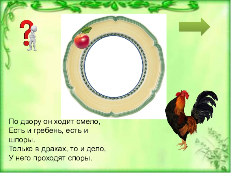 ПЕТУХПо двору он ходит смело, Есть и гребень, есть и шпоры. Только в драках, то и