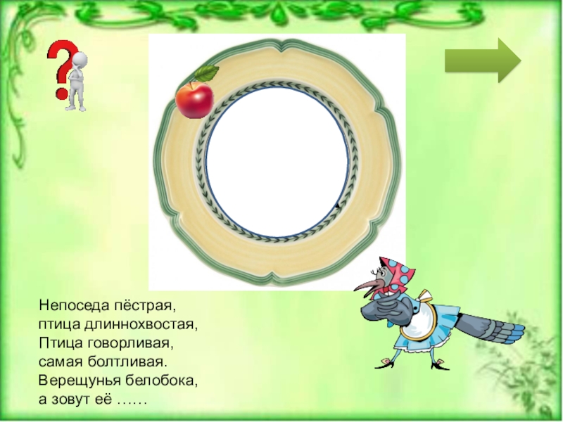 СОРОКАНепоседа пёстрая,птица длиннохвостая,Птица говорливая,самая болтливая.Верещунья белобока,а зовут её ……