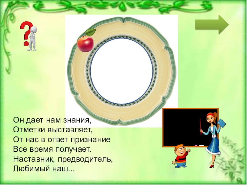 УЧИТЕЛЬОн дает нам знания,Отметки выставляет,От нас в ответ признаниеВсе время получает.Наставник, предводитель,Любимый наш...