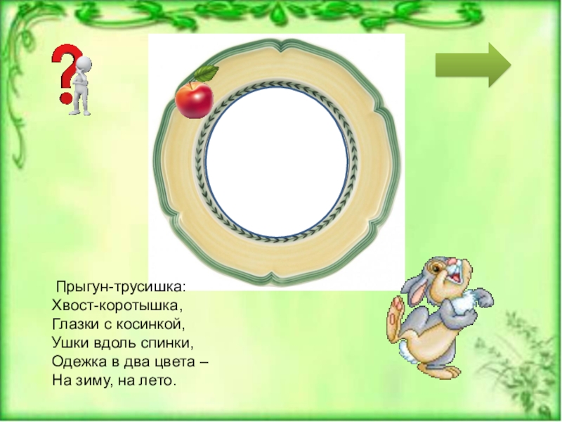ЗАЯЦ Прыгун-трусишка: Хвост-коротышка, Глазки с косинкой, Ушки вдоль спинки, Одежка в два цвета – На зиму, на