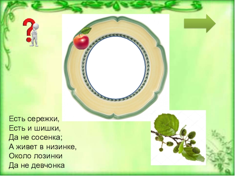 ОЛЬХАЕсть сережки,Есть и шишки,Да не сосенка;А живет в низинке,Около лозинкиДа не девчонка