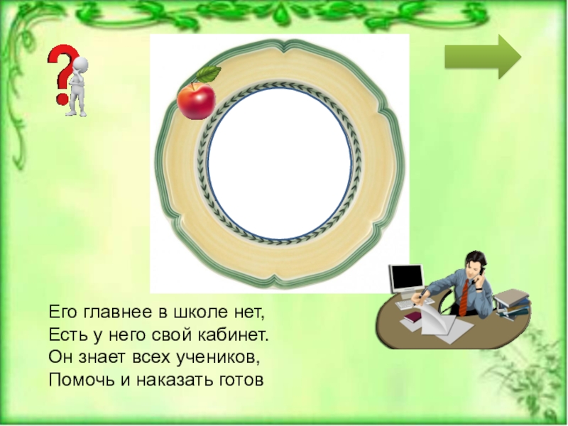 ДИРЕКТОРЕго главнее в школе нет,Есть у него свой кабинет.Он знает всех учеников,Помочь и наказать готов