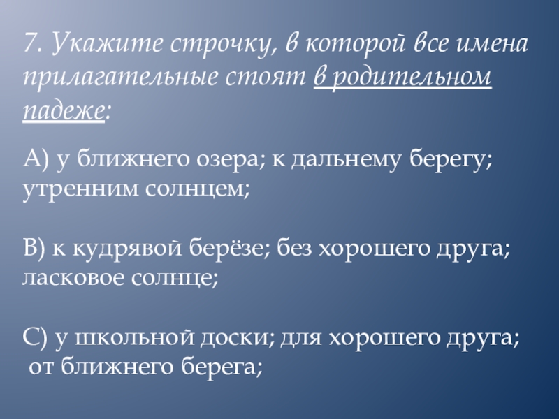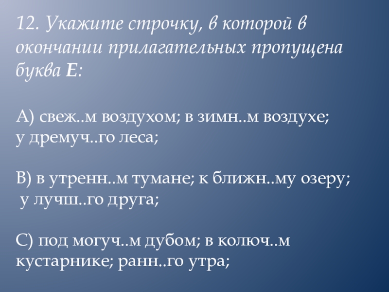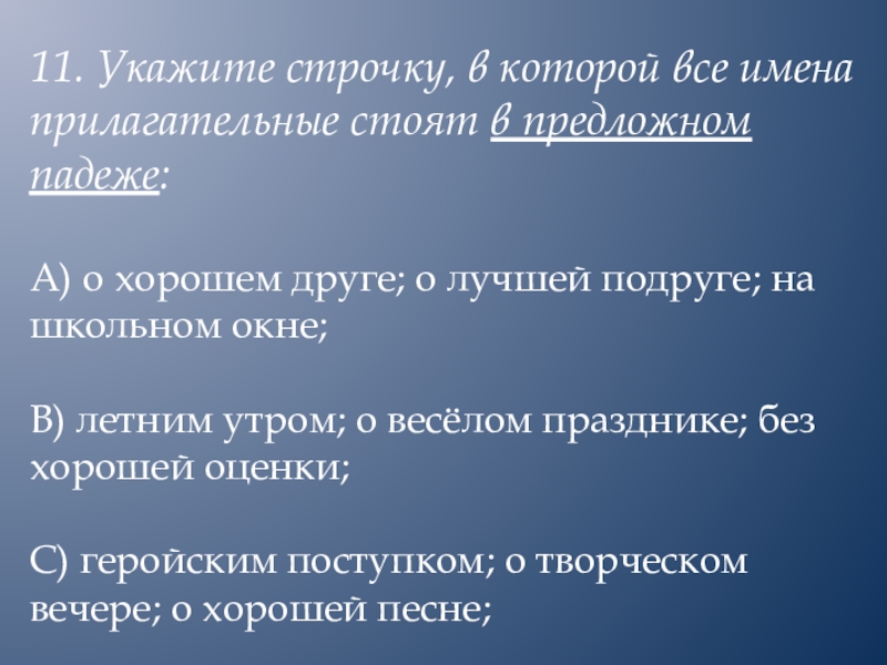 Слайд 1211. Укажите строчку, в которой все имена прилагательные стоят в предложном