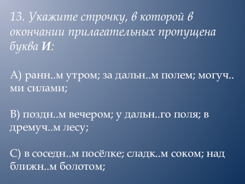 Слайд 1413. Укажите строчку, в которой в окончании прилагательных пропущена буква И: