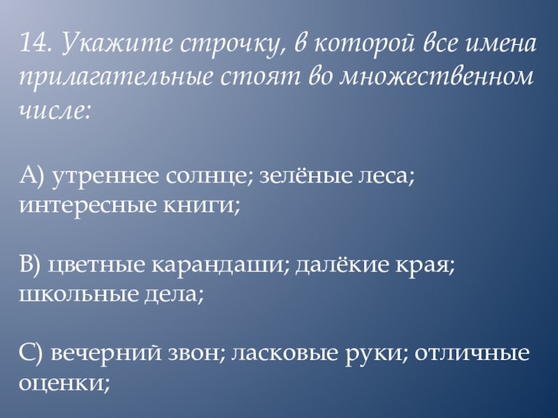 Слайд 1514. Укажите строчку, в которой все имена прилагательные стоят во множественном