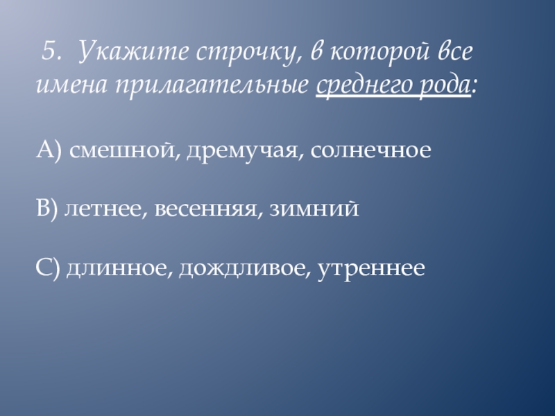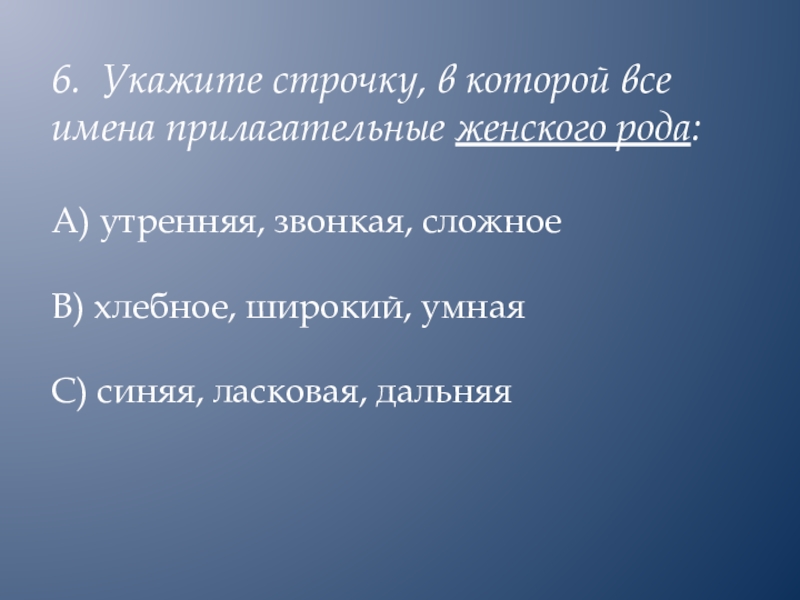 Слайд 6 5. Укажите строчку, в которой все имена прилагательные среднего рода: