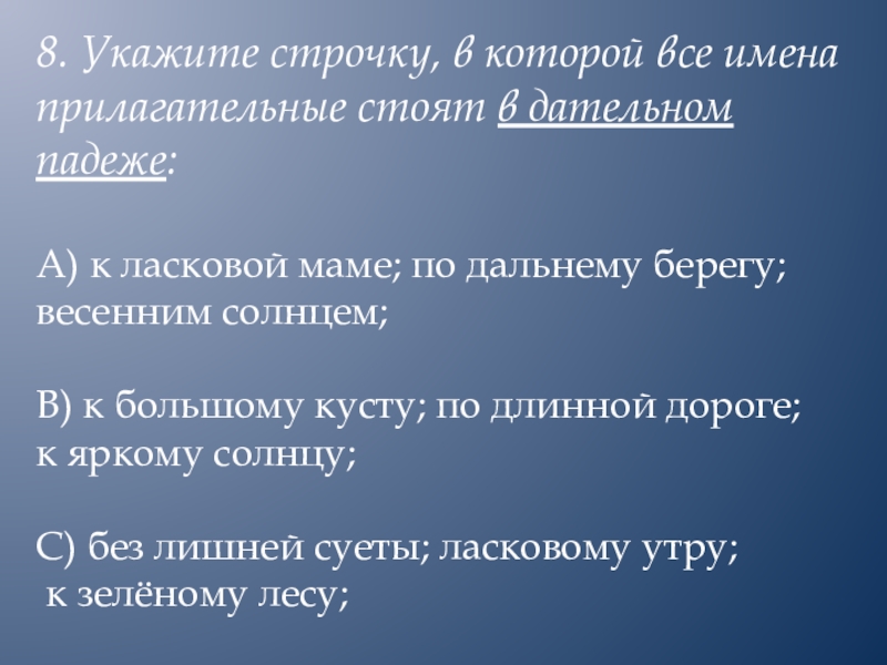 Слайд 98. Укажите строчку, в которой все имена прилагательные стоят в дательном