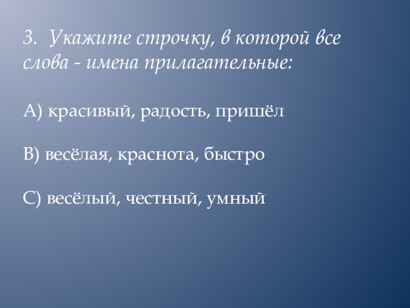 Слайд 43. Укажите строчку, в которой все слова - имена прилагательные: