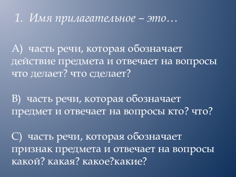 С) часть речи, которая обозначает признак предмета и отвечает на вопросы какой? какая? какое?какие?