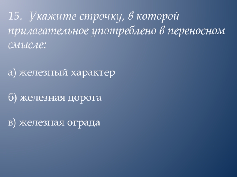 Слайд 1615. Укажите строчку, в которой прилагательное употреблено в переносном смысле: