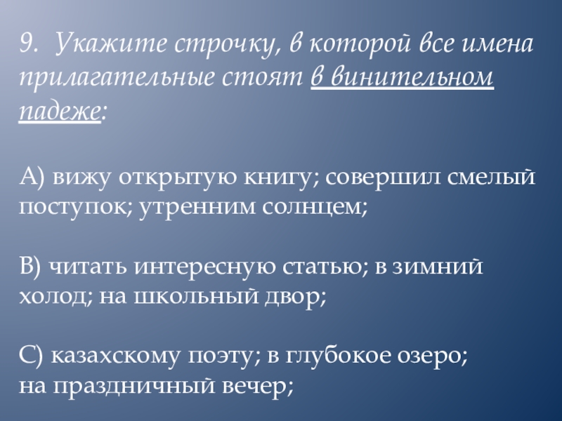 Слайд 109. Укажите строчку, в которой все имена прилагательные стоят в винительном