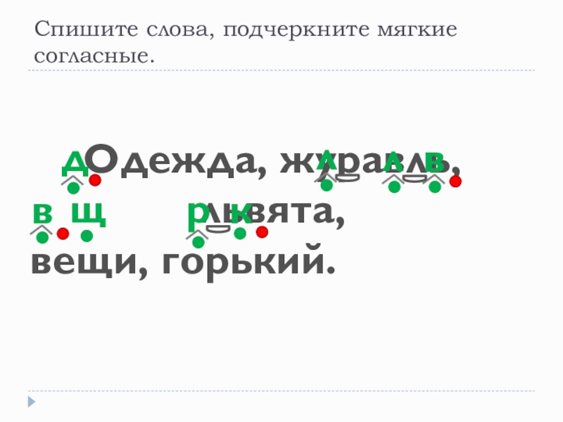 Спишите слова, подчеркните мягкие согласные.Одежда, журавль, львята,вещи, горький.дллввщрк