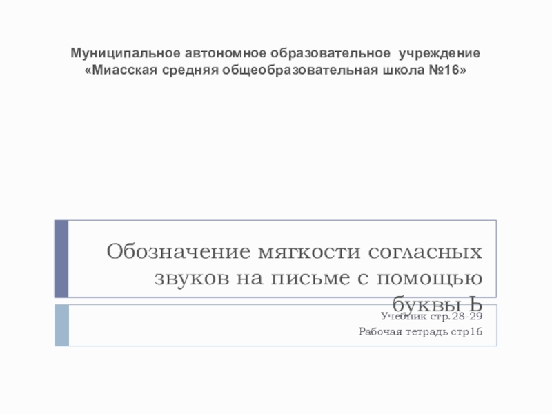 Обозначение мягкости согласных звуков на письме с помощью буквы ЬУчебник стр.28-29Рабочая тетрадь стр16Муниципальное автономное образовательное учреждение «Миасская