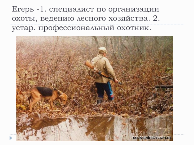 Слайд 5Егерь -1. специалист по организации охоты, ведению лесного хозяйства. 2. устар.