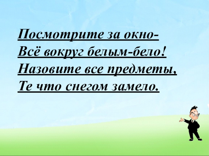 Посмотрите за окно-Всё вокруг белым-бело!Назовите все предметы,Те что снегом замело.