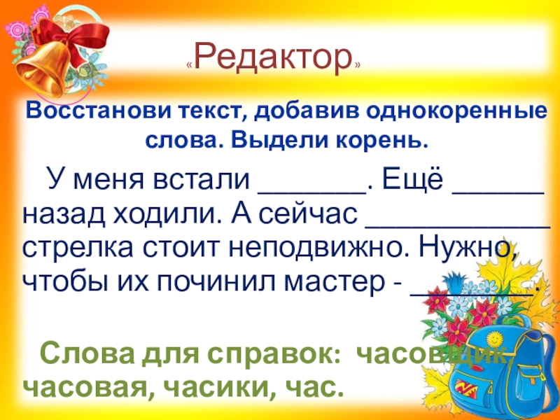 Слова для справок: часовщик, часовая, часики, час.