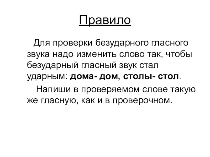 Правило    Для проверки безударного гласного звука надо изменить слово так, чтобы безударный гласный звук