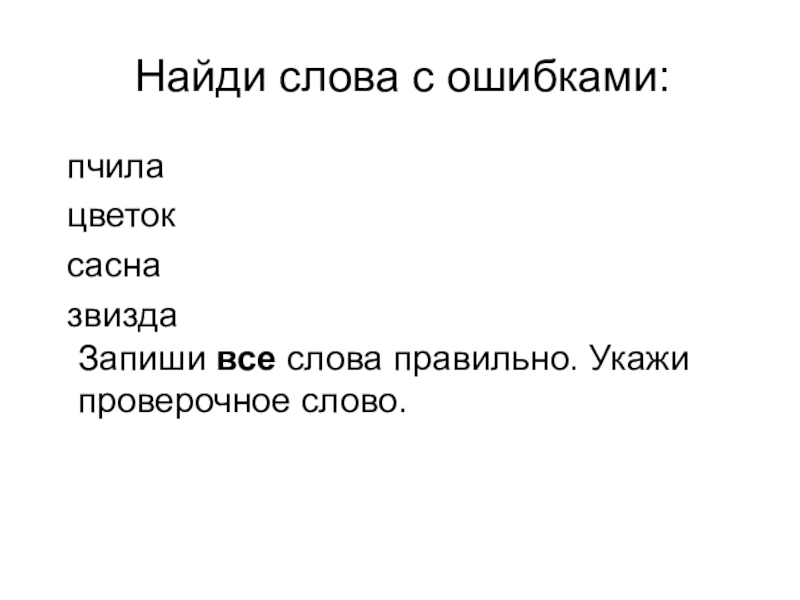 Найди слова с ошибками: пчила цветок сасна звизда Запиши все слова правильно. Укажи проверочное слово.