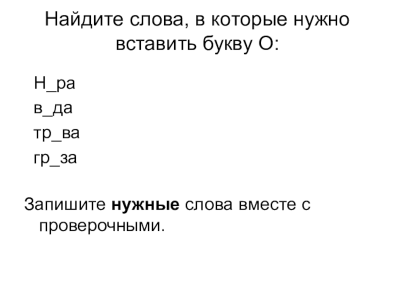 Найдите слова, в которые нужно вставить букву О:   Н_ра в_да тр_ва гр_за Запишите нужные