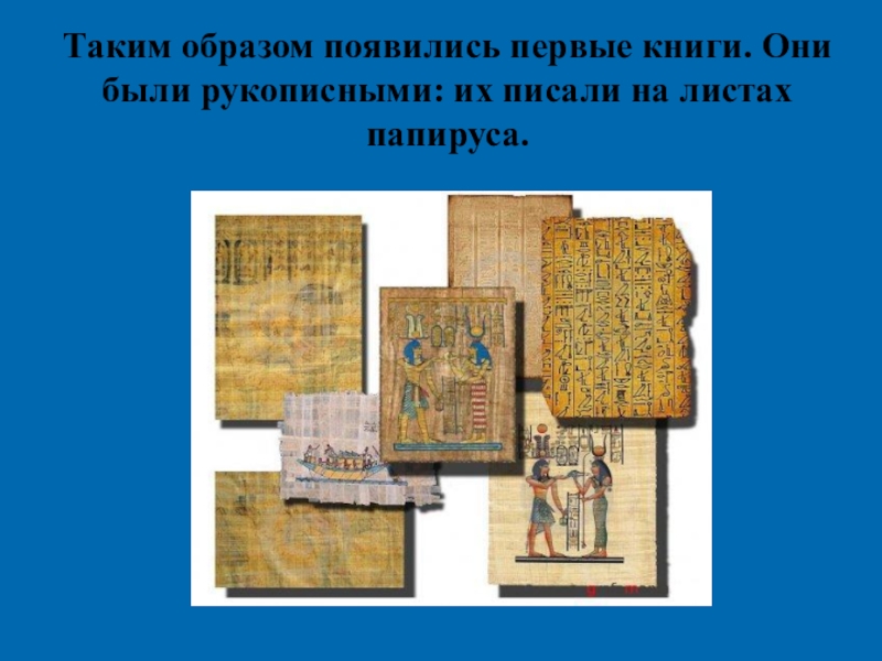 Таким образом появились первые книги. Они были рукописными: их писали на листах папируса.