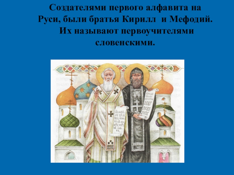 Создателями первого алфавита на Руси, были братья Кирилл и Мефодий. Их называют первоучителями словенскими.