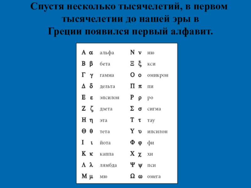 Спустя несколько тысячелетий, в первом тысячелетии до нашей эры в Греции появился первый алфавит.