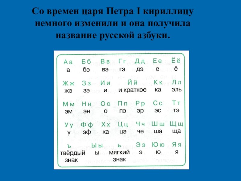 Со времен царя Петра I кириллицунемного изменили и она получила название русской азбуки.