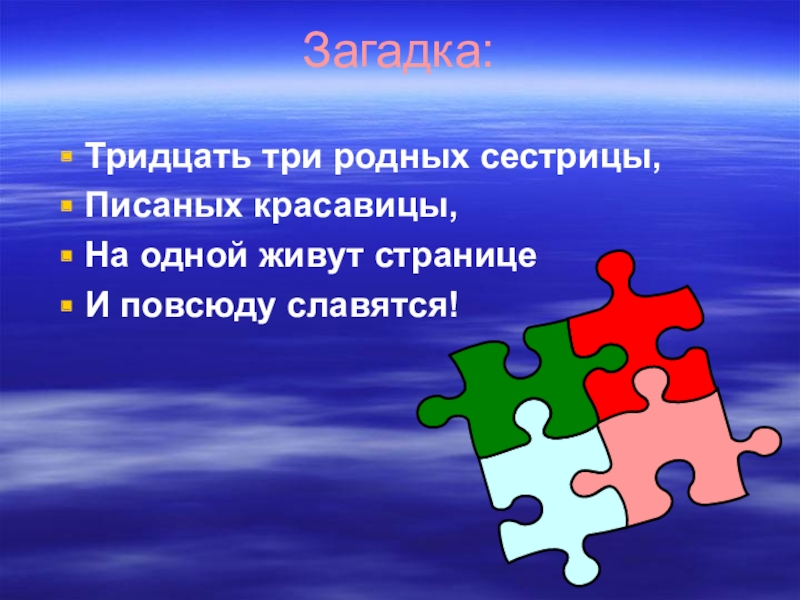 Загадка: Тридцать три родных сестрицы,Писаных красавицы,На одной живут страницеИ повсюду славятся!