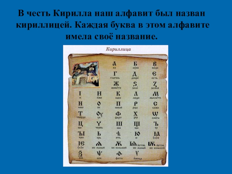 В честь Кирилла наш алфавит был назван кириллицей. Каждая буква в этом алфавите имела своё название.