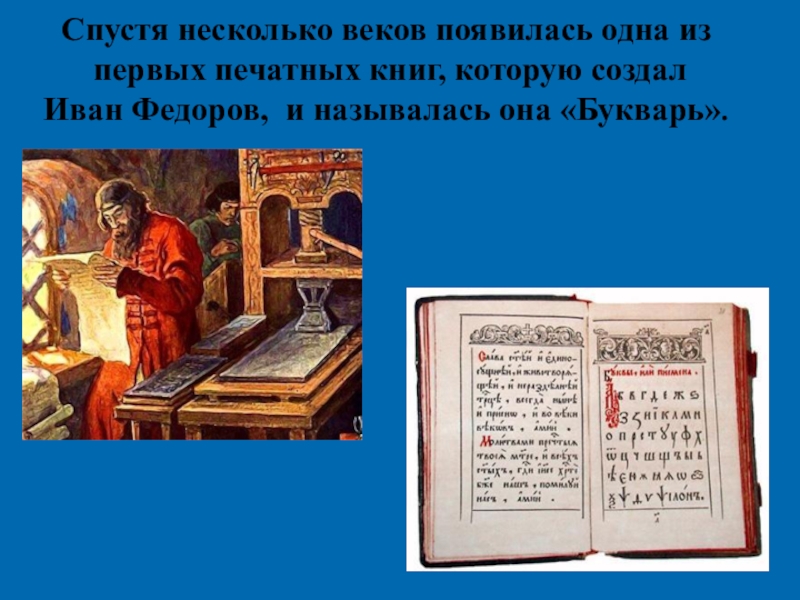 Спустя несколько веков появилась одна из первых печатных книг, которую создал Иван Федоров, и называлась она «Букварь».