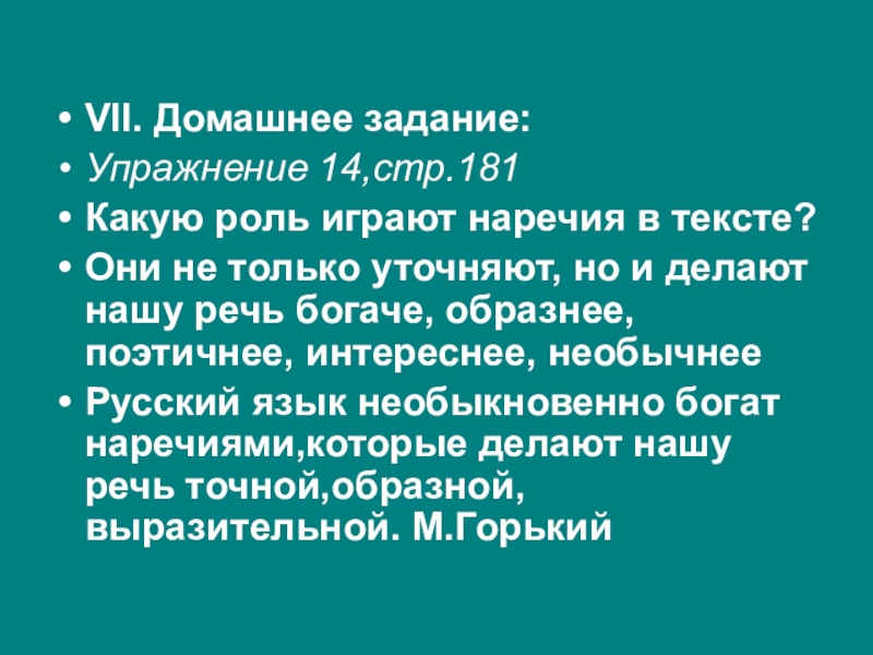 Русский язык необыкновенно богат наречиями,которые делают нашу речь точной,образной, выразительной. М.Горький