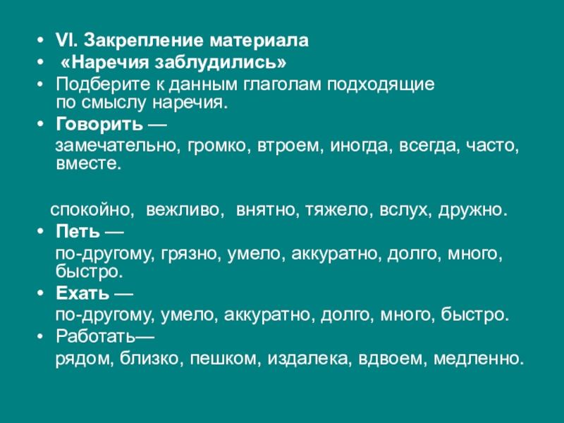 речи наречие за курс 7 класса; дать еще раз понятие об этой части речи (попутное повторение синтаксиса членов предложения); лексика-антонимы, синонимы.
