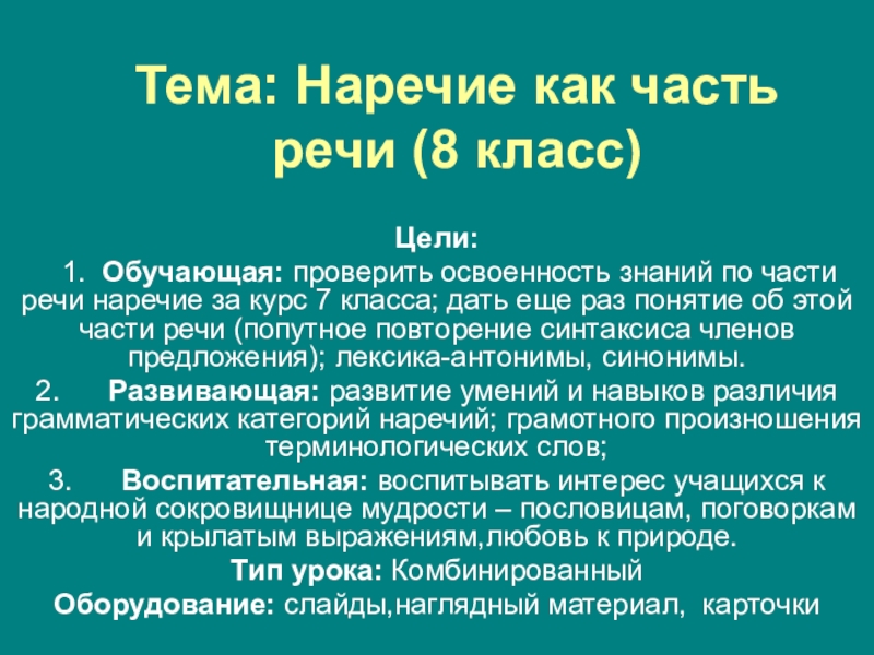 2. Развивающая: развитие умений и навыков различия грамматических категорий наречий; грамотного произношения терминологических слов;