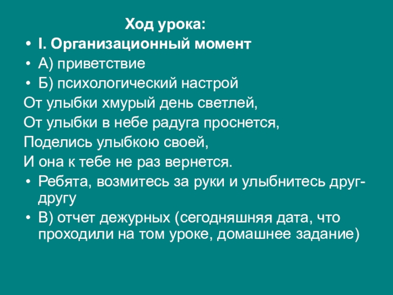 В) отчет дежурных (сегодняшняя дата, что проходили на том уроке, домашнее задание)