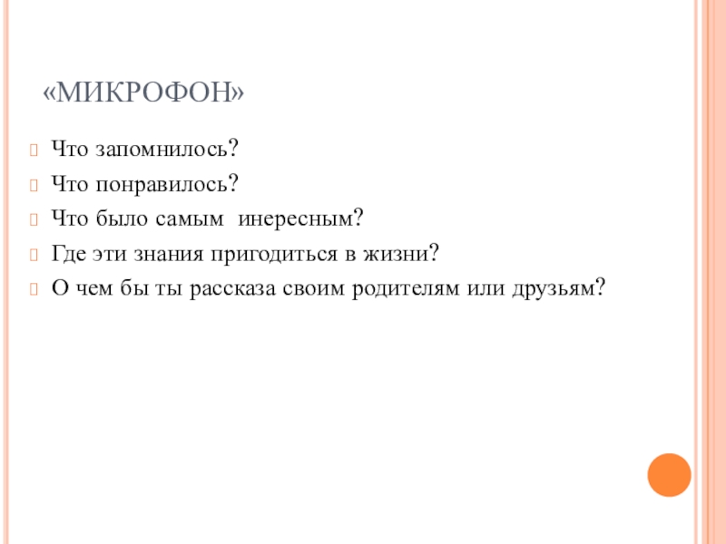 «МИКРОФОН»Что запомнилось?Что понравилось?Что было самым инересным?Где эти знания пригодиться в жизни?О чем бы ты рассказа своим родителям
