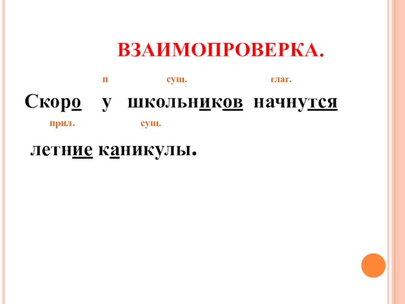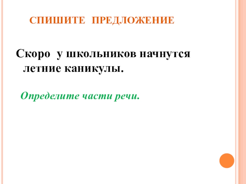 СПИШИТЕ ПРЕДЛОЖЕНИЕСкоро у школьников начнутся летние каникулы. Определите части речи.