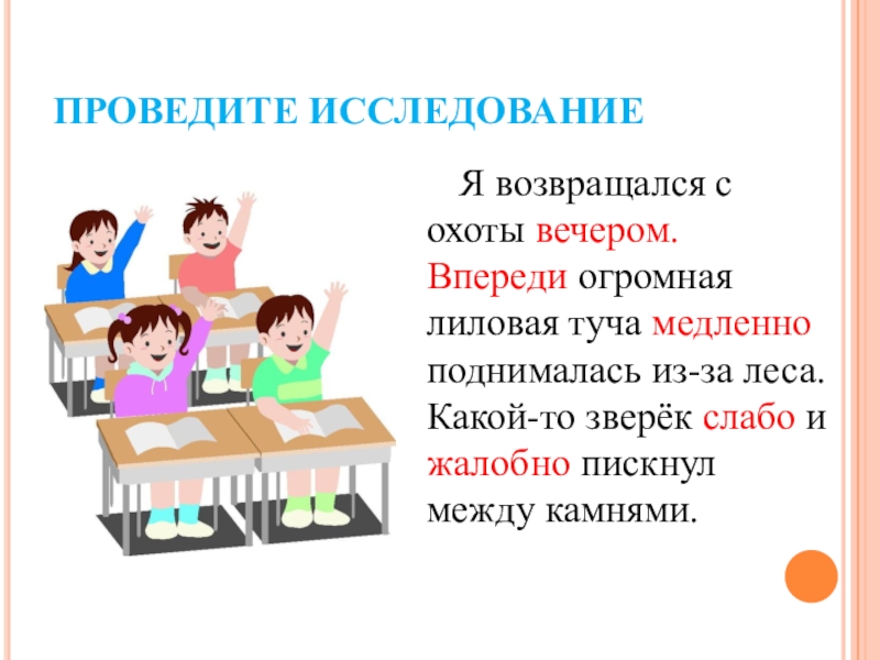 ПРОВЕДИТЕ ИССЛЕДОВАНИЕ   Я возвращался с охоты вечером. Впереди огромная лиловая туча медленно поднималась из-за леса.