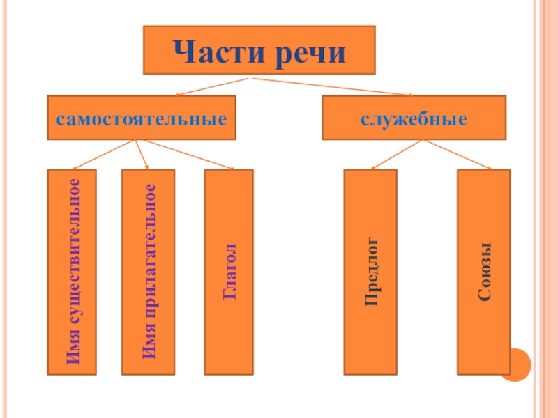 Части речисамостоятельныеслужебныеИмя существительноеИмя прилагательноеГлаголПредлогСоюзы