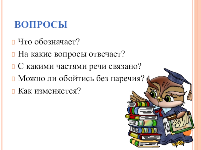 ВОПРОСЫЧто обозначает?На какие вопросы отвечает?С какими частями речи связано?Можно ли обойтись без наречия?Как изменяется?