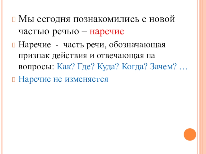 Слайд 20Мы сегодня познакомились с новой частью речью – наречие