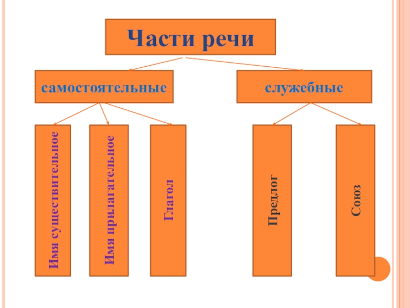 Части речисамостоятельныеслужебныеИмя существительноеИмя прилагательноеГлаголПредлогСоюз