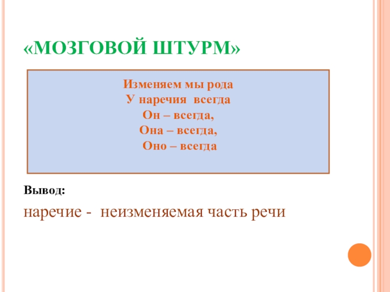 «МОЗГОВОЙ ШТУРМ» Вывод: наречие - неизменяемая часть речиИзменяем мы родаУ наречия всегдаОн – всегда,Она – всегда, Оно