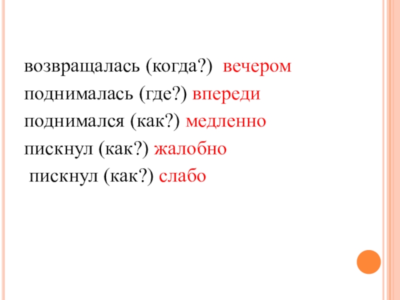 возвращалась (когда?) вечеромподнималась (где?) впередиподнимался (как?) медленнопискнул (как?) жалобно пискнул (как?) слабо