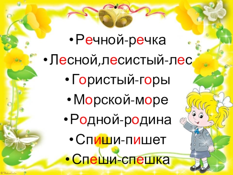 Речной-речкаЛесной,лесистый-лесГористый-горыМорской-мореРодной-родинаСпиши-пишетСпеши-спешка